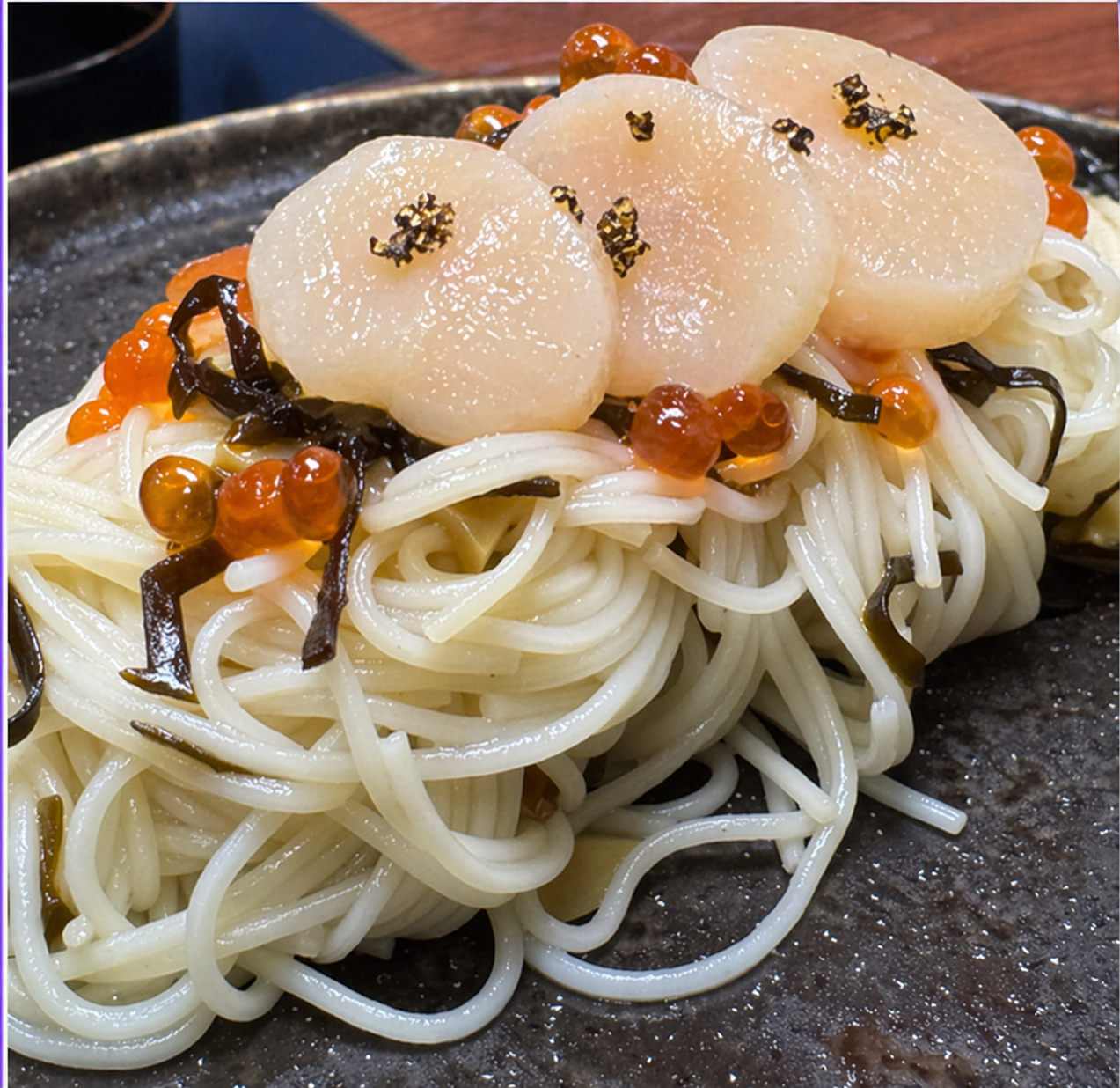 A refined fusion of Italian and Japanese flavors. Chilled somen noodles are gently tossed in a light, umami-rich sauce and topped with aromatic black truffle imported from Italy. Finished with buttery sautéed button mushrooms, bursts of briny ikura, and super sweet Japanese Hotate sashimi for a rich, indulgent bite.